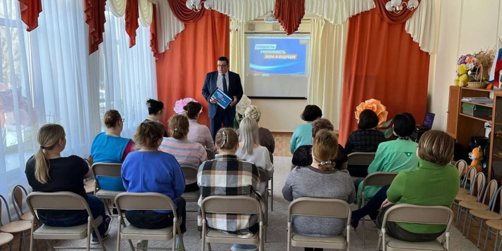 Следующая встреча прошла с коллективом детского сада №16 микрорайона Ожерелье, в прошлом году он помог заменить окна, в том числе и в зале, где проходила встреча.