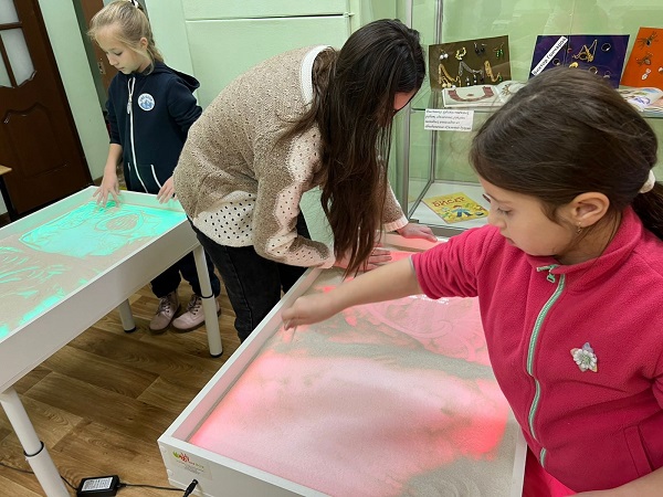Перед началом занятия юные участники сделали специальную гимнастику, которая помогает развивать гибкость и ловкость пальцев. Это важный этап, который подготавливает руки к дальнейшей работе с песком. После разминки ребята приступили к творческому процессу.