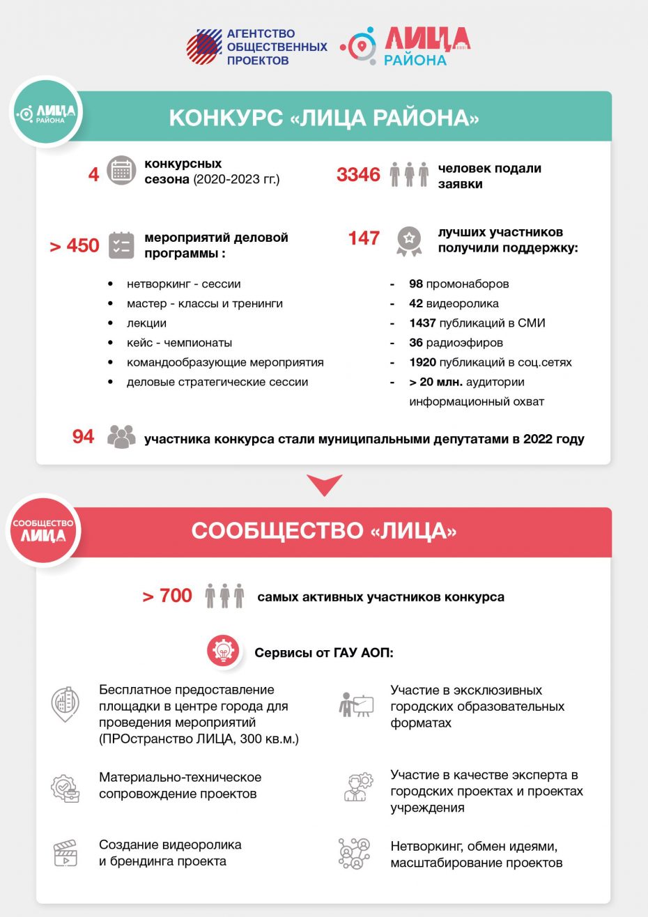 В рамках содействия развитию программы Мэра Москвы «Мой район» проводится ежегодный городской конкурс социальных проектов «ЛИЦА района» (далее – Конкурс). В период 2020–2023 гг. на Конкурс было подано 3346 заявок, из них 88 участников стали победителями, 166 призерами, 160 дипломантами.