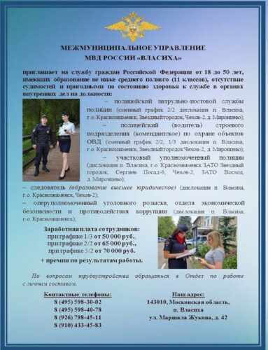 Межмуниципальное управление МВД России «Власиха» приглашает на службу