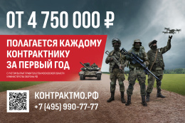Единоразовая выплата заключившим контракт с Минобороны РФ в Московской области составляет 2 300 000 рублей (1 900 000 — региональная спецвыплата, 400 000 — федеральная).
