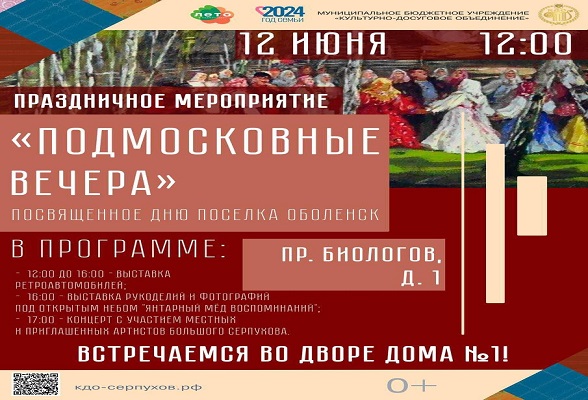12 июня в 12:00 жителей и гостей округа приглашают на «Подмосковные вечера». Это традиционное мероприятие посвящено Дню поселка Оболенск. В нынешнем году событие совпадает с Днем России и продолжает череду местных праздников, ведь совсем недавно свой 30-летний юбилей отметил Дом культуры Оболенска.