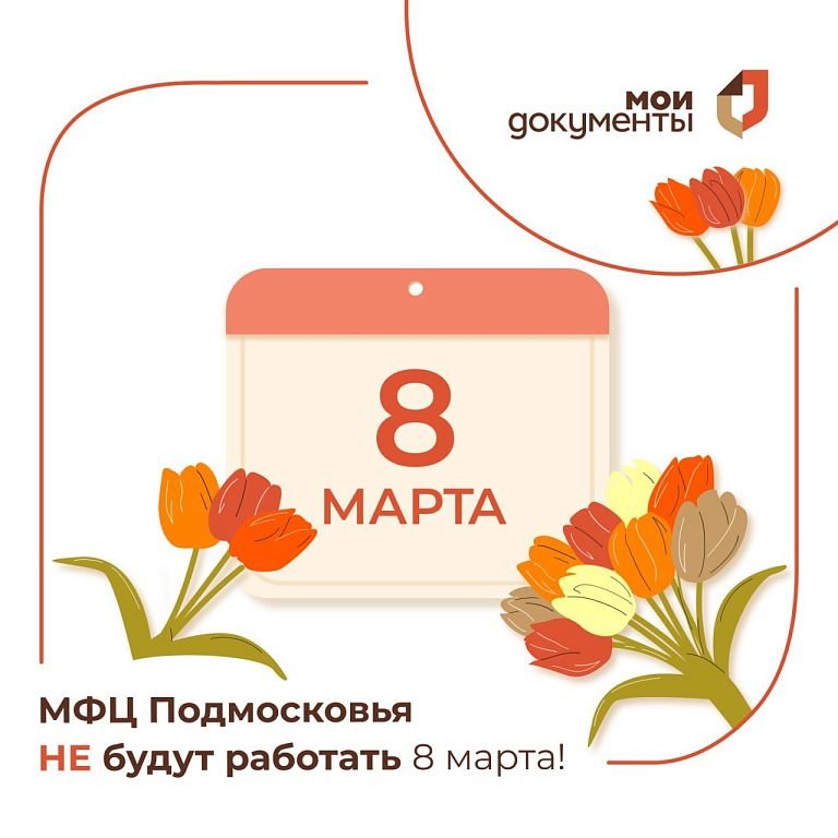 8 марта – нерабочий день 7 и 9 марта – все офисы работают по своему обычному графику Уточнить время работы конкретного МФЦ можно на региональном портале госуслуг (https://uslugi.mosreg.ru/mfc/mfcmap).
