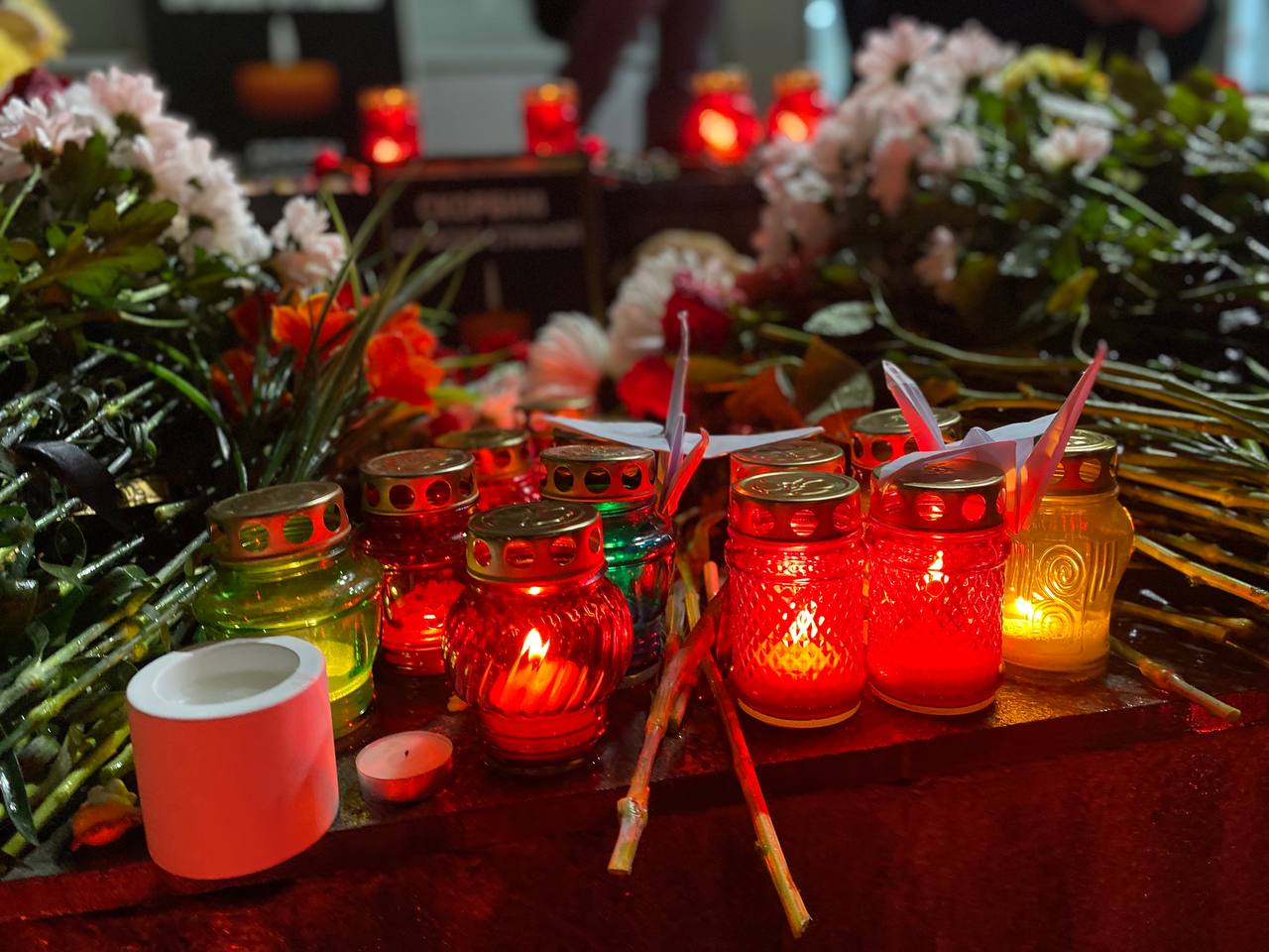 На площади перед зданием администрации в Рузе из свечей выложили фразу: «Крокус. Скорбим». Участникам акции раздали фигурки журавлей.