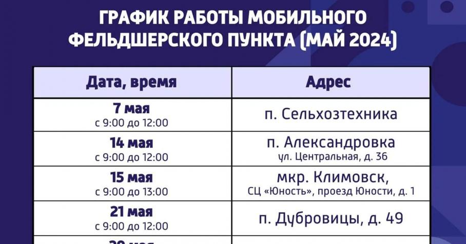 15 мая с 9:00 до 13:00 ФАП на колесах будет работать в мкр. Климовск по адресу: СЦ «Юность», проезд Юности, дом № 1. 21 мая с 9:00 до 12:00 все желающие могут посетить ФАП по адресу: поселок Дубровицы, дом № 49; 29 мая с 9:00 до 12:00 все желающие смогут посетить мобильный ФАП в селе Покров.