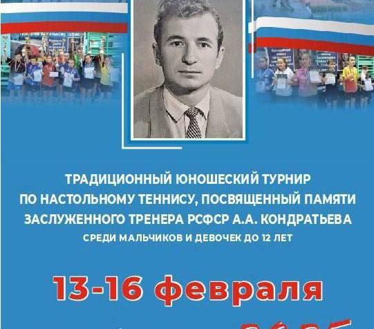Порядка 200 юных теннисистов из восьми регионов России с 13 по 16 февраля примут участие в турнире по настольному теннису, посвященном памяти заслуженного тренера РСФСР Александра Кондратьева.