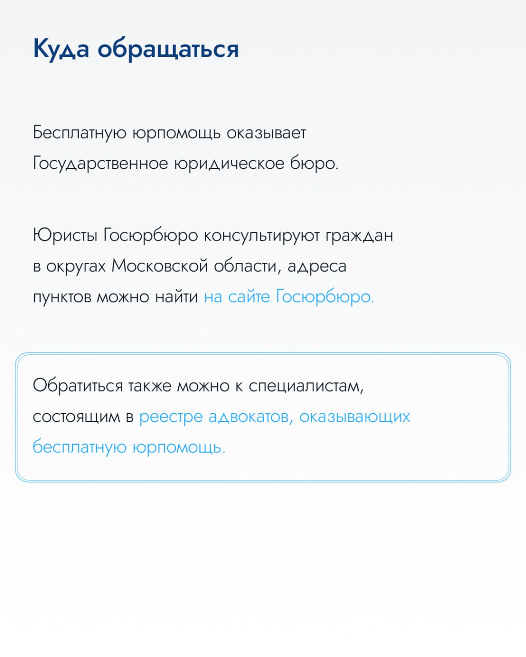 обзор новинок и изменений в законодательстве; разъяснительные материалы по новым (актуальным) законам; информирование о бесплатных юридических консультациях для жителей округа, участников СВО и членов их семей; информирование о приемах жителей в различных учреждениях Наро-Фоминского городского округа.Администрацией Наро-Фоминского городского округа особое внимание уделяется оказанию юридической помощи, в том числе участникам СВО и их семьям.